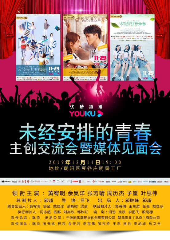 《未经安排的青春》发布会海报12月09日讯,优酷独播青春励志剧《未经安排的青春》主创交流会暨媒体见面会将于12月11日晚19:00在北京市朝阳区豆各庄明星工厂举办。该剧导演吕飞,总制片人邬超,主演黄宥