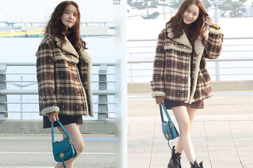 林允儿身穿棕色高领毛衣,搭配同色系格子铺毛外套,看起来保暖度100%。但往下看,她裸腿单穿直逼大腿根部超短裙,在气温5度大秀雪白逆天长腿,搭配黑色短靴时尚度满分。