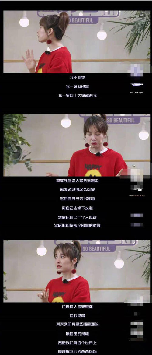 吴听在综艺《你怎么这么好看》节目中回顾自己的生活经历回应全网黑,她说被网友骂“自己去抬冰箱,自己一个人修下水道,一个人吃饭,即使被全网黑的时候也没有人帮助你”,说到这里吴昕泪目