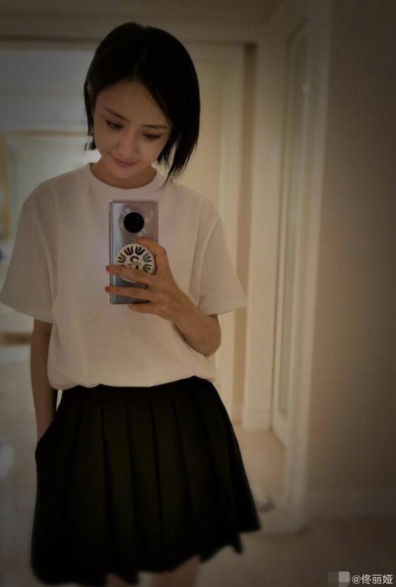 佟丽娅晒短发自拍 白衣黑裙似高中女生
