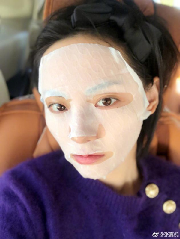 照片中张嘉倪靠坐在车内,穿着深紫色毛衣,还敷着面膜,仅有眼睛与嘴唇露在外面。眼睛乌黑明亮有神,灿如星子;嘴唇粉嫩水润,娇艳如花。