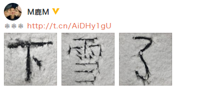 12月16日晚,鹿晗在网上晒雪景,并俏皮地在雪地上留下了自己的字迹。雪地上写有“下雪了”的字样,看来鹿晗看到下雪也是极开心的,所有的兴奋都藏在这三个字里了。