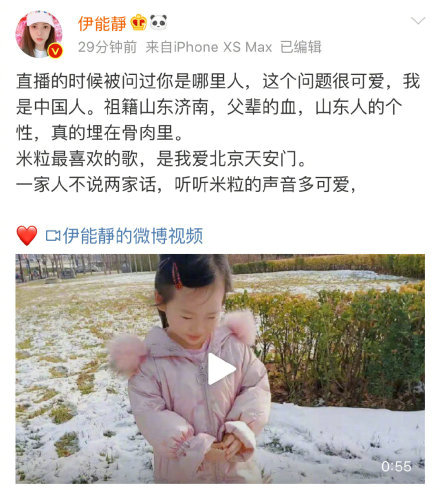 12月21日凌晨,伊能静上传了女儿米粒唱《我爱北京天安门》的视频,并发文称“直播的时候被问过你是哪里人,这个问题很可爱,我是中国人。祖籍山东济南,父辈的血,山东人的个性,真的埋在骨肉里。米粒最喜欢的歌,是我爱北京天安门。一家人不说两家话,听听米粒的声音多可爱!”视频中米粒奶声奶气的唱着歌萌力十足,还说自己去天安门看过降旗仪式,看到了军人叔叔。