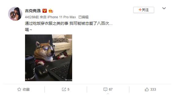 12月22日,吉克隽逸在微博发文否认恋情传闻,称:“通过吃饭穿衣服之类的事,我可能被恋爱了八百次…嗝~”。