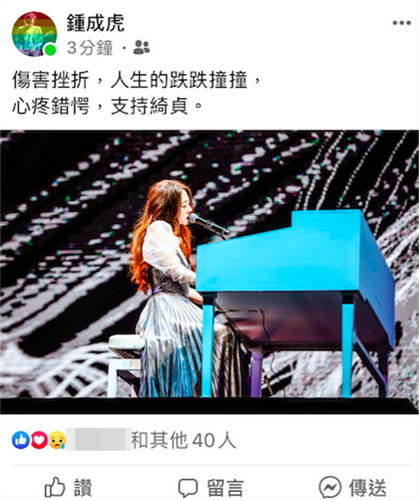 陈绮贞沦为小三被状告 钟成虎发文极力护旧爱