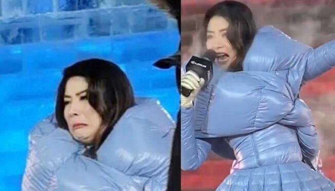 陈慧琳穿羽绒裙子现身哈尔滨 唱歌冻到表情失控