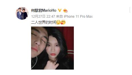 12月27日,赌王四房儿子何猷君在微博上晒出自己与超模老婆奚梦瑶的合影,并发文称“二人世界的时间”。照片中,新婚小夫妻皆是身穿黑衣,奚梦瑶长发披肩配淡妆,产后状态极佳,何猷君将