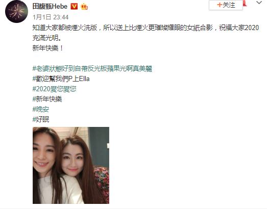 1月1日,田馥甄Hebe在微博晒出和好姐妹Selina任家萱的亲密自拍,并配文称“知道大家都被烟火洗版,所以送上比烟火更璀璨耀眼的女纸合影,祝福大家2020充满光明。新年快乐!&rdquo
