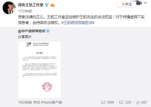 1月2日,王凯工作室转发中产律师事务所发布的案件播报,并发文称:“感谢法律的正义。王凯工作室坚定维护王凯先生的合法权益!对于传播虚假不实信息者,会持续依法维权。”据悉,中产律师