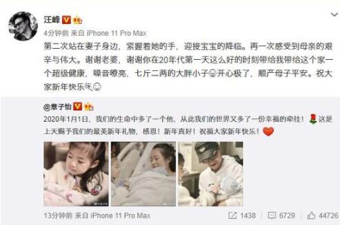 汪峰感谢章子怡产子 曝细节:1月1日顺产 7斤2两
