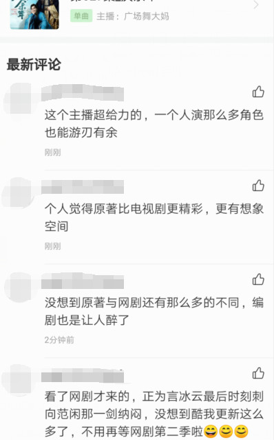 不仅如此,有声书《庆余年》相比网剧还有独到特色。其一是主播“广场舞大妈”的专业表现力。这从网友们留言打call“这个主播超给力,一个人演那么多角色也能游刃有余”就能得到印证;另外,有声书是将作家猫腻的原著原封不动一字不差地演绎,这也是网剧无法做到的,对此有网友留言“个人觉得原著比电视剧精彩,更有想象力”,也有网友称“没想到原著与网剧还有那么多不同”。