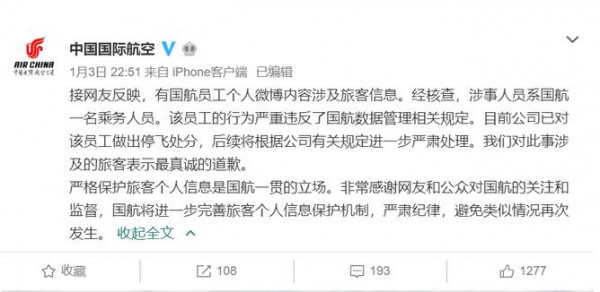 1月3日,中国国际航空官微发表了一则通告,对于国航员工私自泄露明星个人信息一事作出回应。
