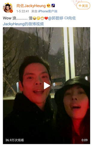 1月5日,向佐在微博上晒出了和郭碧婷在大雪中的视频,并配文:“Wow,浪漫”。视频中,郭碧婷戴着渔夫帽,少女感满满,夫妻俩开心的对着镜头一起喊“耶”,开