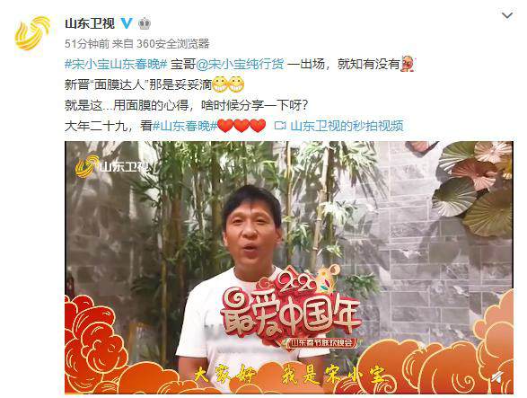 近日山东卫视的官微再次官宣了一位重磅嘉宾——喜剧演员宋小宝。此前,孟鹤堂周九良在“李佳琦式安利山东春晚”时已经透露了这一消息。据本次山东春晚总导演房经纬透露,2020山东春晚已进入紧张的排练阶段,节目类型涵盖歌曲、舞蹈、器乐、小品、魔术、杂技等,女排山东籍队员和教练也将参与录制。