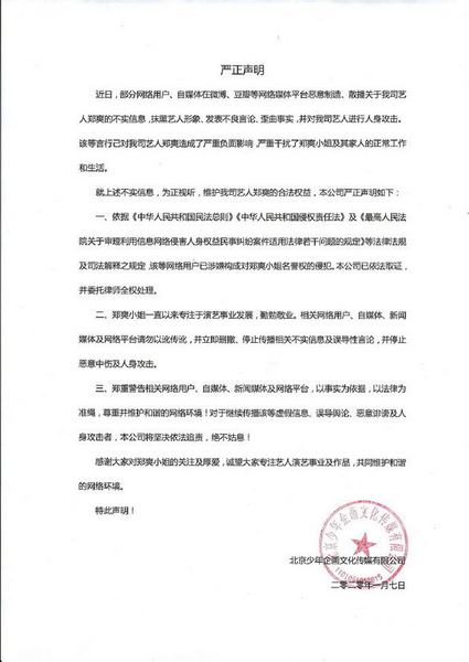 郑爽方针对不实言论发声明:已侵犯名誉权将追责