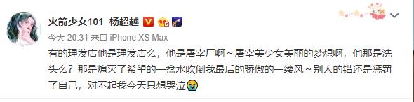 1月7日晚,杨超越在社交账号发文吐槽理发店,称理发店为“屠宰场”,表示“今天只想哭泣”她写道:“有的理发店他是理发店么,他是屠宰厂啊?屠宰美