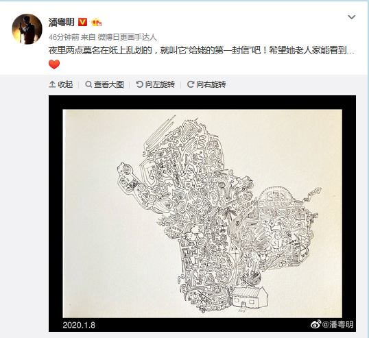1月8日,潘粤明在社交平台分享了一张他给姥姥写的“信”。他写道,“夜里两点莫名在纸上乱划的,就叫它‘给姥的第一封信’吧!希望她老人家能看到&