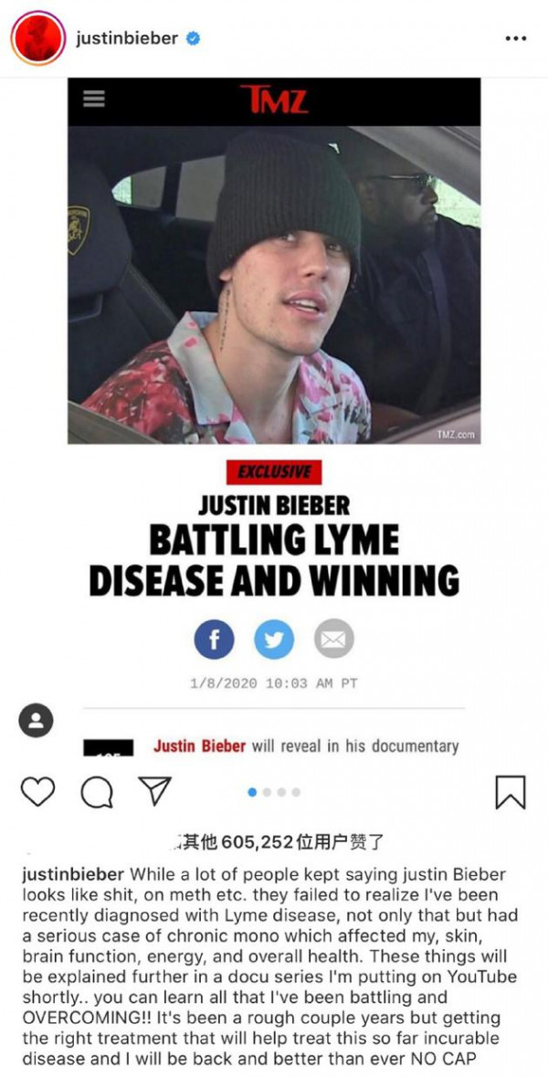 近日,比伯在社交网站上发文透露近况,回应外界长期以来的质疑,并如实告知自己的身体情况:“虽然很多人一直说我看起来很糟糕,像shit…像嗑了药等,但是他们并不知道到我最近被诊断出患有莱姆病,不仅如此,还患有严重的慢性单核细胞病,影响了我的皮肤、大脑功能、精力和整体健康。这些事情我会在我即将发布的纪录片中进一步的去解释。通过这些你会知道我一直抗争和克服的一切!这几年对我来说是很艰难,但得到正确的治疗,会对这种迄今为止无法治愈的疾病有帮助,我会调整自己,然后以比以往任何时候都好的状态回归。”