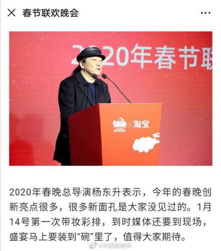 据春节联欢晚会微信公众号消息,中央广播电视总台2020年《春节联欢晚会》将于1月14日第一次带妆彩排。2020年春晚总导演杨东升表示,今年的春晚创新亮点很多,很多新面孔是大家没见过的。此前杨东升也曾表