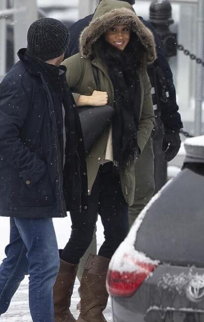 照片中,梅根裹得严严实实,带帽羽绒服看起来非常暖和,这次也不光腿了,裤子靴子一样都不少。
