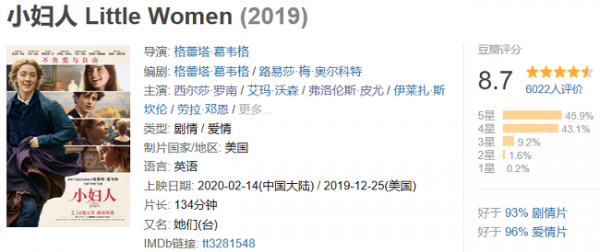 《小妇人》自圣诞节北美上映以来就口碑票房双丰收。影片日前入围包括最佳影片、最佳女主角、最佳女配角、最佳改编剧本、最佳服装设计、最佳原创音乐在内的奥斯卡6项重磅提名,颁奖季目前总共拿下152个提名和49个奖项,冲奥形势一片大好。真挚动人的爱情故事征服了美国前总统奥巴马、迪士尼CEO罗伯特·艾格、奥斯卡影后娜塔莉·波特曼等业内外大咖。被片中爱情深深打动的“劳模姐”杰西卡·查斯坦直接在推特引用片中一段爱情台词,并配上大哭脸来表达被戳到的激动心情。《小妇人》目前豆瓣8.7、知乎8.5、时光网8.1、imdb8.3、烂番茄新鲜度95%、mtc91分,国内外各大网站清一色8分以上的高分实力证明影片品质。而影片的吸金能力更是堪称惊喜,北美开画五天揽入2900万美元,远超业内预期。而且在初期不到20个地区上映时,全球票房就已突破一亿美元大关,“小”妇人爆发的“大”能量不可小觑。