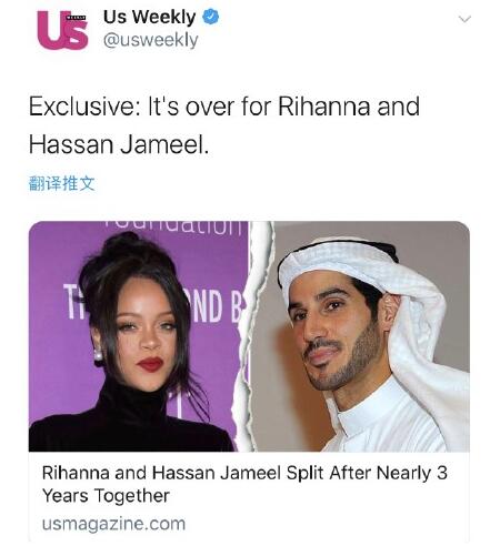 1月18日,据外媒爆料,蕾哈娜被曝与恋爱近三年的阿拉伯富商Hassan Jameel分手。
