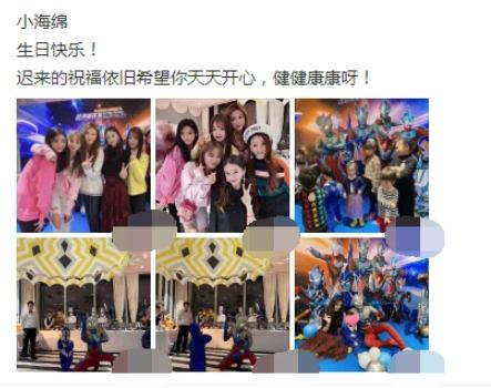 1月18日,有网友晒出小海绵3岁生日趴的现场照。照片中,Baby与一众女闺蜜合影,小海绵身穿蓝色超人服,摆出“十字死光”的pose,十分可爱.