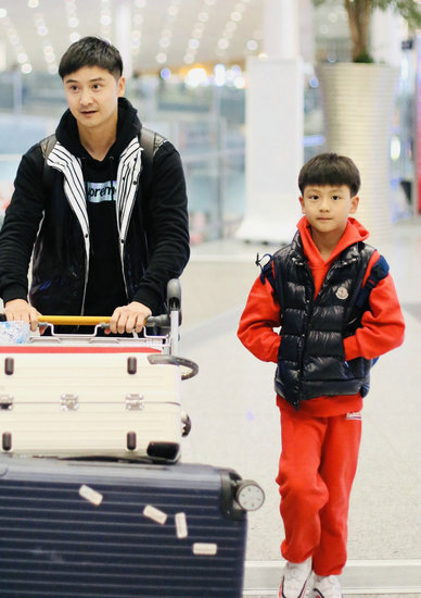 田亮素颜现身机场 小亮仔乖巧跟随萌态十足