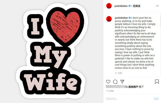 1月20日,比伯在个人社交网站发文表白妻子海莉,并配上一张“I love my wife”的图片。