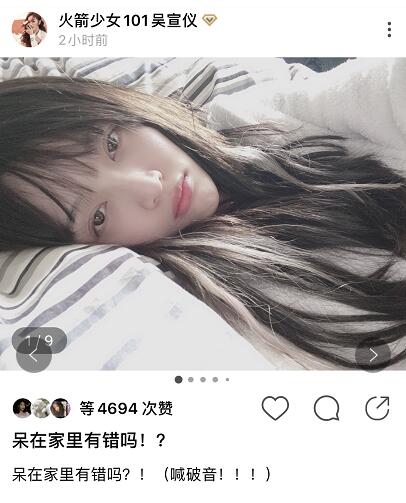 1月20日,吴宣仪晒出自己躺在床上的自拍照,并配文:“呆在家里有错吗?!”还配上了“宅在家被骂”“起晚被骂”“睡晚被