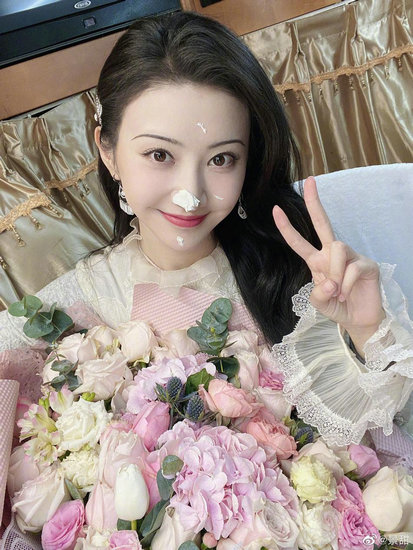 19日,景甜晒照庆祝新戏杀青。照片中,景甜捧着鲜花比耶,鼻子和脸上还有奶油,很是甜美可爱。