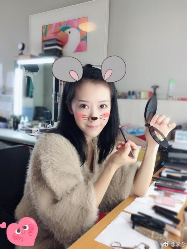 照片中李念身处化妆间,左手一面小镜子,右手一只眉笔,正在对镜描眉。长发披散,毛茸茸的衣袖中漏出一截皓腕,对着镜头笑的温婉清浅。而照片则被后期p上了可爱萌趣的红脸、猫咪胡子以及老鼠耳朵等卡通元素,看起来萌萌哒。
