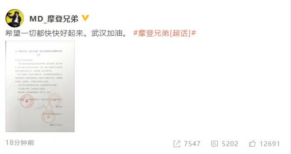 1月22日,摩登兄弟刘宇宁发布演唱会武汉站延期举行的公告。他表示新型冠状病毒肺炎疫情严峻,为响应国家关于疫情管理的要求,保证大家的健康和安全,公司决定暂缓“成长风暴”武汉站演唱会的演出,具体演出时间将另行通知。已售门票在延期改期后仍然有效。