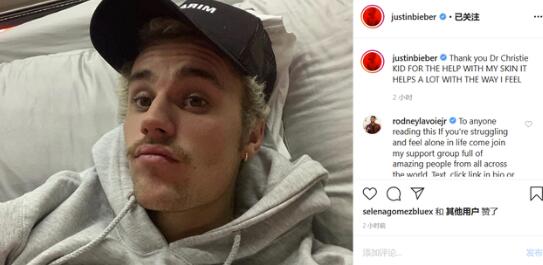 1月23日,比伯在个社交网站晒出自拍,发文着重感谢了自己的医生,表示这位医生为他的皮肤提供了帮助,帮助了他很多。照片中,比伯戴着一顶黑色帽子,穿着灰色卫衣躺在床上,状态看起来很好。1月8日,比伯通过社