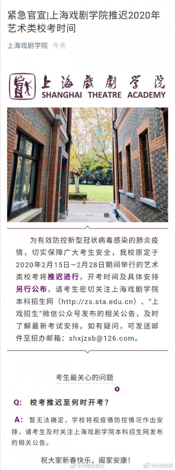 上戏等沪上高校推迟2020年艺考 复考时间另行通知