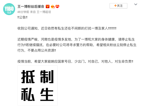 近期疫情严峻,河南也是疫情多发地,为了一博和大家的身体健康,请停止私生行为!若继续骚扰,在必要时公司将寻求警方的帮助,希望相关粉丝立刻停止私生行为,不要占用公共资源!