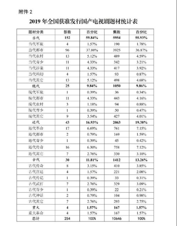 2月6日,国家广电总局发布关于2019年第四季度暨全年全国国产电视剧发行许可情况的通告。2019年,全国生产完成并获得《国产电视剧发行许可证》的剧目254部10646集。其中,现实题材剧目共计177部7004集,分别占总部数、集数的69.69%、65.79%。