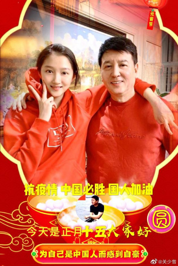 2月8日,关晓彤的父亲关少曾在微博上晒出自己与女儿的合照,照片中父女俩都穿着大红色的衣服,搂着对方的肩膀,笑容灿烂。关少曾还为合照P上了大红色的边框,并在照片上配字“抗疫情,中国必胜,国人加油”、“为自己是中国人而感到骄傲”。还配上自己创作的抗疫打油诗,祝大家“元宵佳节平安健康,团团圆圆,顺顺心心”。