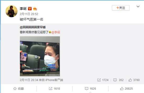 2月11日,有网友在微博发出一张电视新闻的照片,并称:“看新闻居然看见诞哥了。”还特意艾特李诞。从截图的画面中看,一档电视台新闻采访中,一部手机壳却意外抢镜,因为上面是李诞的图像。李诞转发此微博并回应,自黑称:“破坏气氛第一名。”