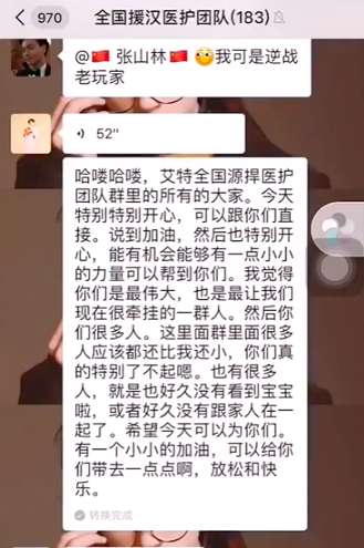 12日,有网友曝出谢娜空降武汉金银潭医护群的聊天视频。视频中,谢娜对医护人员表达了尊敬并为其加油:“我觉得你们是最伟大的,也是最让我们很牵挂的一群人,你们真的特别了不起。”谢娜