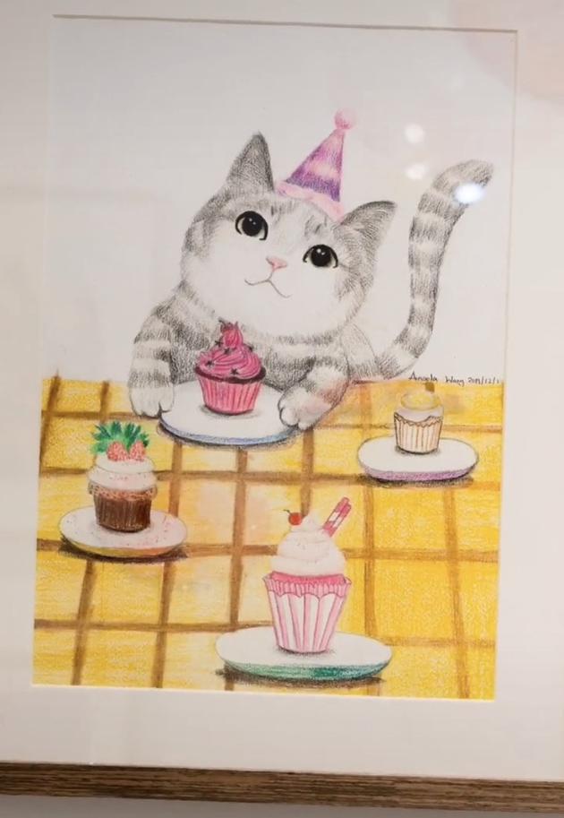 2月17日,李湘在社交平台上晒出了女儿王诗龄Angela的绘画作品,并介绍这是“王诗龄画的猫。”画作上的猫生动可爱,正戴着小礼帽吃蛋糕。