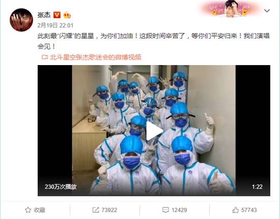2月19日,张杰晒出歌迷会制作的带有医护粉丝发布的相约看张杰演唱会博文截图的视频,为医护粉丝加油:“此刻最‘闪耀’的星星,为你们加油!这段时间辛苦了,等你们平安归来