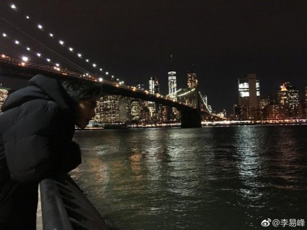 李易峰纽约河畔赏夜景 万家灯火下神情专注且悠然