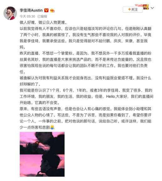 李佳琦回应直播怼粉 斥网络暴力坦言对不起身边人