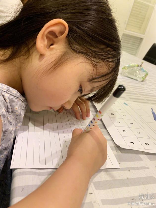 3月4日晚,陈浩民通过绿洲晒女儿写作业的照片,并配文写道:“忍不住想表扬一下她,自觉学习的孩子最可爱,你们说对不对?”照片中,女儿手握笔,趴在书桌上认真的写字,字迹很工整。