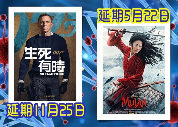除007之外,由刘亦菲主演迪斯尼动画真人版电影《花木兰》原定3月尾上映,早前宣布亚洲区包括中国、日本及韩国等地延期,现暂定为5月22日上映。已宣布上映延期的仲包括黑白版《寄生虫》,迪斯尼与彼思动画嘅《1/2的魔法》,木村拓哉声演嘅《多啦A梦》系列最新电影《大雄的新恐龙》,原定本月6日在日本开画,片商宣布因疫情扩散押后上映,翌日举行的谢票活动亦告取消。