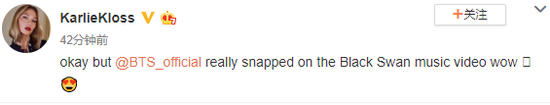 3月5日,超模Karlie Kloss变身防弹少年团的迷妹,在微博发文:“okay but BTS really snapped on the Black Swan music video