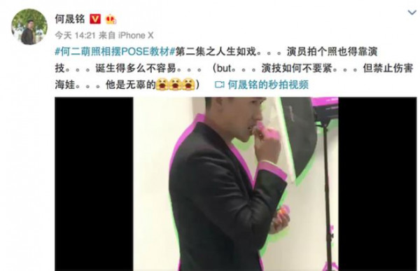 12月7日下午,何晟铭通过微博晒自己一段短视频,并写道:“人生如戏,演员拍个照也得靠演技,诞生得多么不容易,“并为“海娃”喊冤…&hell