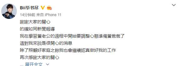 毕书尽称:“谢谢大家的关心,的确如同新闻报道,我在学习当老公的过程中开始要调整心态准备当爸爸了,这对我来说是很开心的消息,除了照顾好家庭之余我也会继续认真做好我的工作”,最后对关心此事的网友表示感谢。