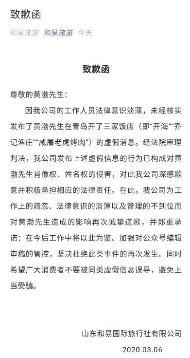 3月9日,北京星权律师事务所发布黄渤姓名权肖像权的案件简讯:2020年3月6日,被告山东**国际旅行社有限公司遵照北京市朝阳区人民法院一审民事判决书[京0105民初21819号],就其公然发布黄渤先生在青岛开设多家饭店的虚假信息,进而侵害黄渤先生姓名权、肖像权,误导广大消费者的行为,向黄渤先生公开致歉。本律师事务所再次提醒广大网络用户及消费者朋友,切勿被同类虚假信息误导!